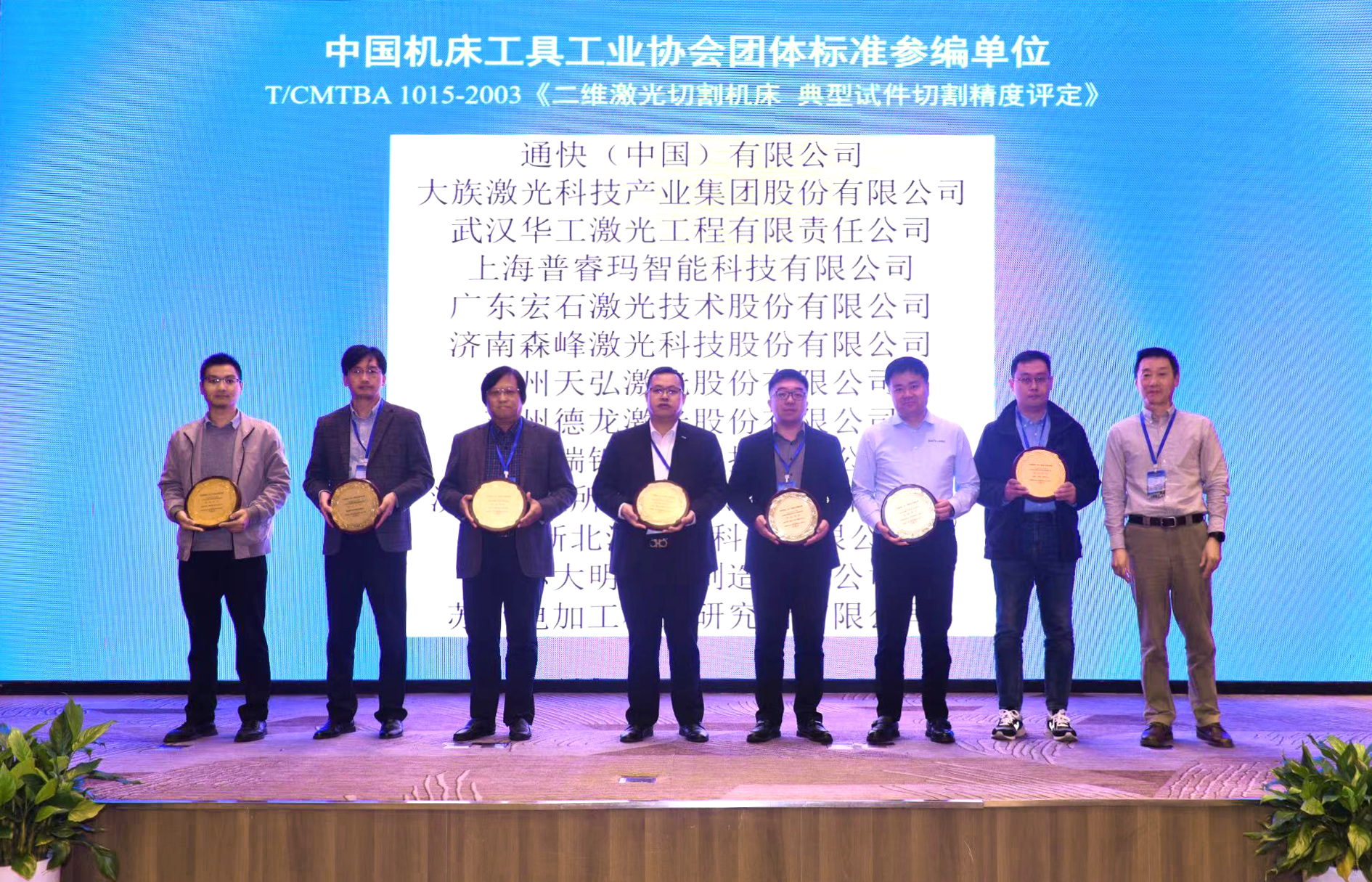 2023年11月15日至11月17日,宏山激光受邀出席中國機床工具工業協會特種加工機床分會2023年會員大會。會上,宏山激光獲頒中國機床工具工業協會團體標準T/CMTBA 1015-2003《二維激光切割機床 典型試件切割精度評定》參編單位牌匾
